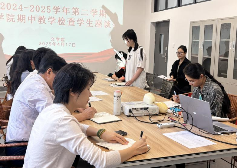 为深入贯彻落实学校期中教学检查工作部署,进一步加强和改进教学管理,确保教学质量,4月17日上午,我院在南校区体育馆105召开了2024-2025学年第二学期期中教学检查学生座谈会。文学院院长黄宇鸿,常务副院长梁镨文,教学副院长蔡森,学工副院长裴景旺,汉语言教研室主任姜玮,汉语国际教育教研室副主任李雪,及文学院全体学生教学信息员参加了本次座谈会。