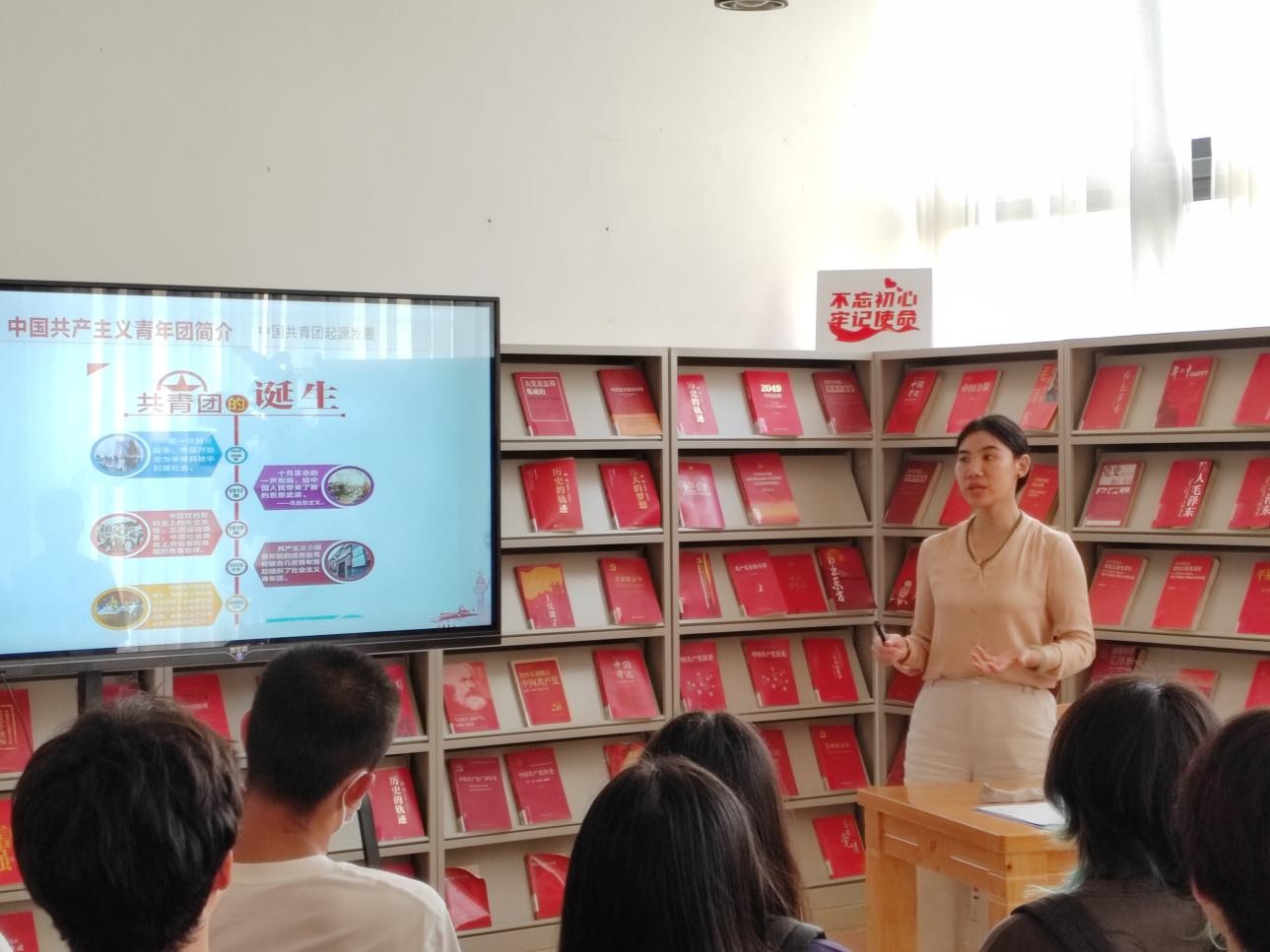 4月17日下午5:00,何敏芝老师在图书馆三楼“红色阅读角” 举办红色知识专题讲座,本期讲座的主题是高举团旗跟党走——扛起民族复兴的大旗。 (张新玲摄)