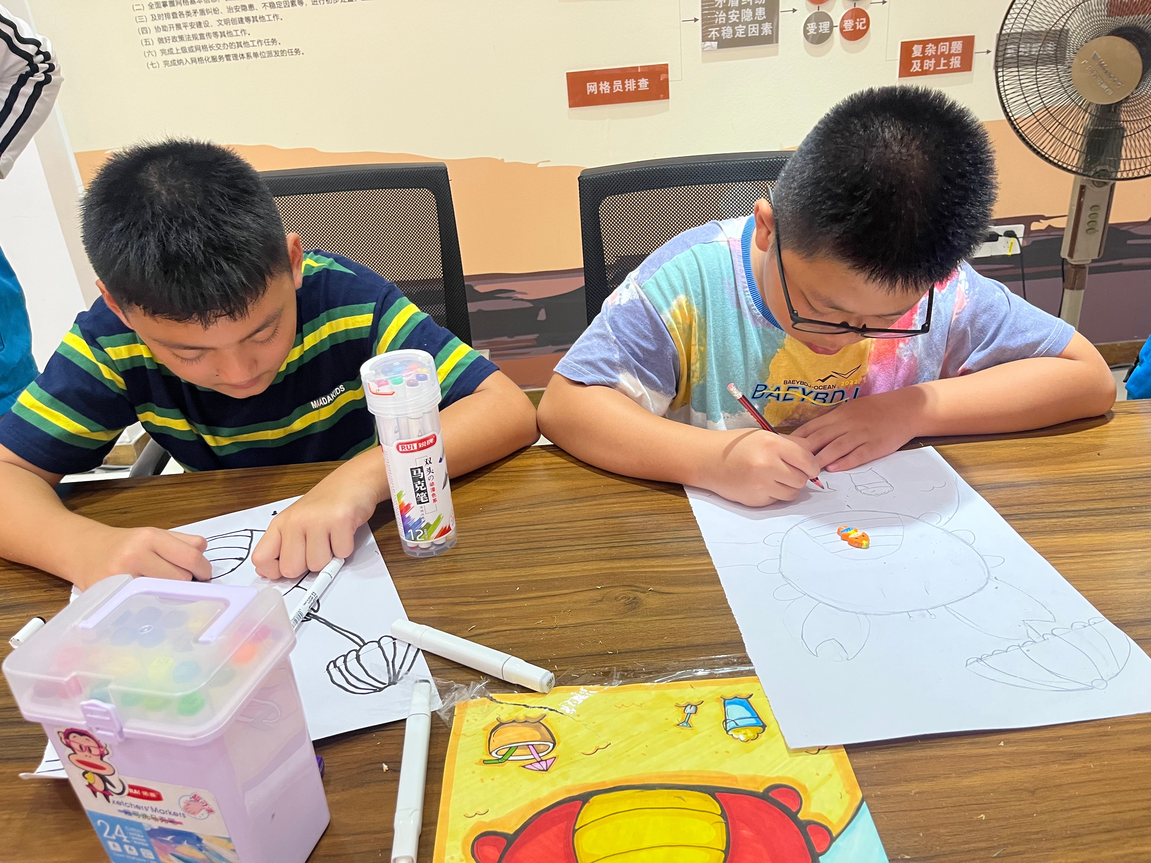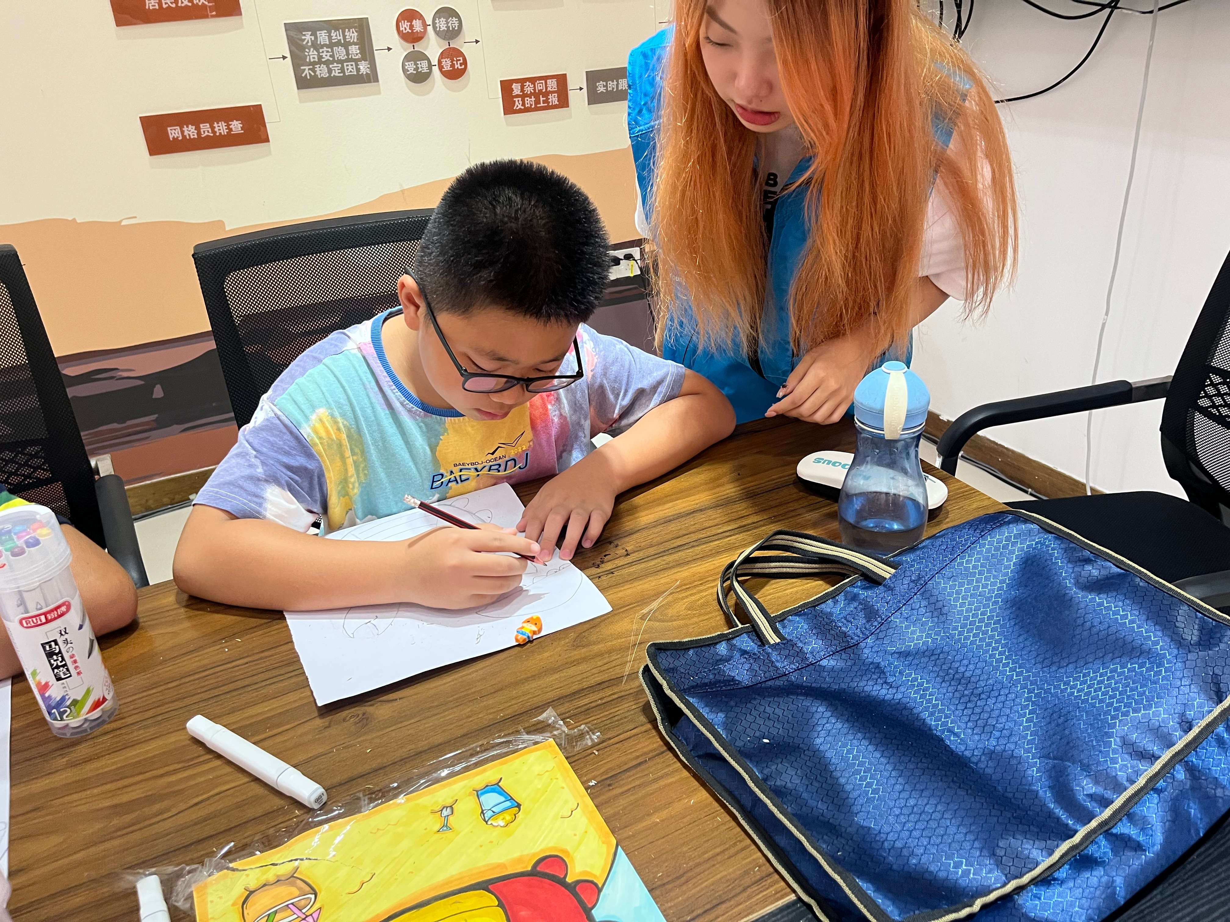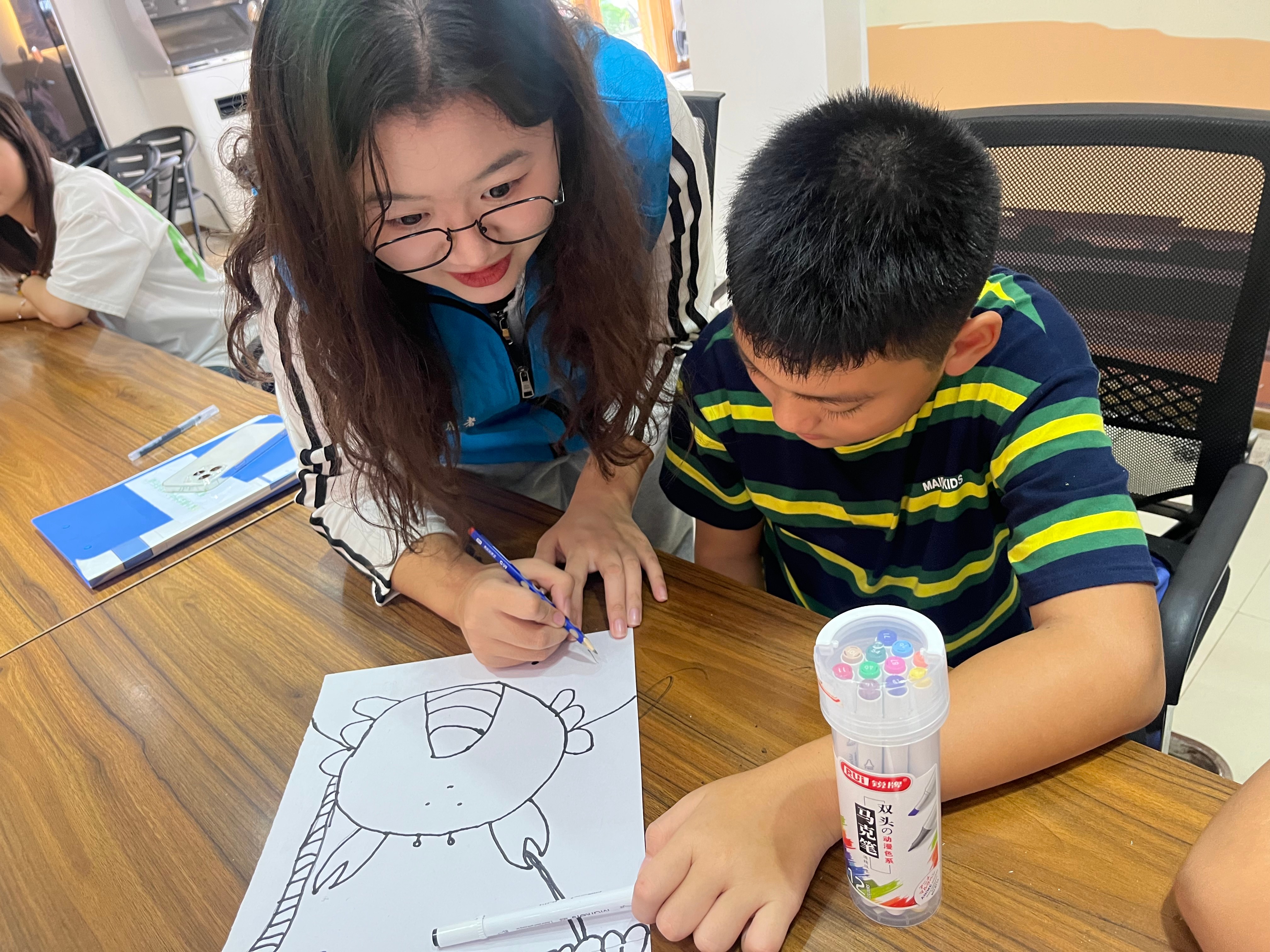 在课堂上,为了与孩子们增进感情,志愿者们开始了自我介绍,和孩子们沟通交流,随后在一片活跃的气氛中开始了本次课程的教学。志愿者们先以有趣的方式讲述今日画作的主题,接着告诉小朋友们如何将它们画出来,在志愿者们的指导下,孩子们拿出彩色画笔和空白画本开始绘画起来。很快,孩子们就画出了轮廓,甚至有的孩子已经开始为画作涂色了。