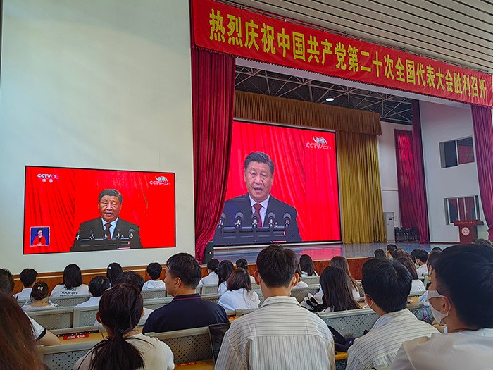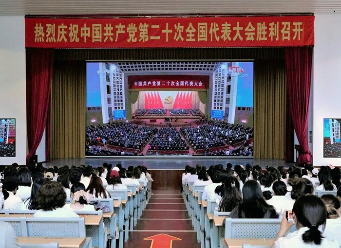 党的二十大是在迈上全面建设社会主义现代化国家新征程、向第二个百年奋斗目标进军的关键时刻召开的一次十分重要的大会。老师同学们身着统一服装,聚精会神的收看了大会盛况,在聆听完习近平总书记的报告后,大家纷纷表示要继续牢记初心使命,认真领会和贯彻落实党的二十大精神,自信自强、守正创新,踔厉奋发、勇毅前行,为全面建设社会主义现代化国家、全面推进中华民族伟大复兴而团结奋斗。