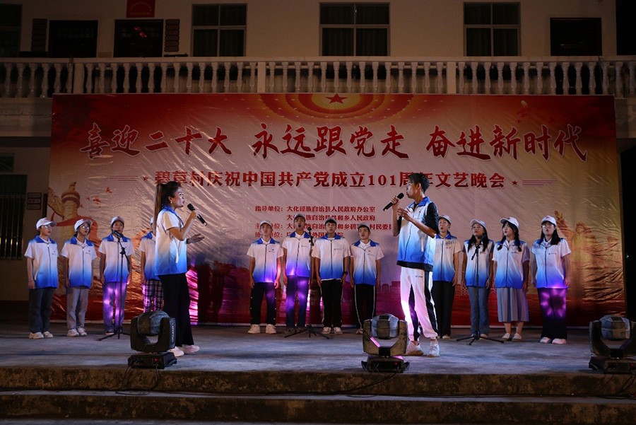 傍晚,在当地政府、村委会和我校共同举办的“喜迎二十大,永远跟党走,奋进新时代”庆祝中国共产党成立101周年主题晚会中,我校师生为乡亲们表演了《穆桂英挂帅》、《美丽中国走起来》、《让世界充满爱》等形式多样的的文艺节目,最后,晚会在抽奖环节中将气氛推向高潮,并在热烈的掌声中圆满结束。