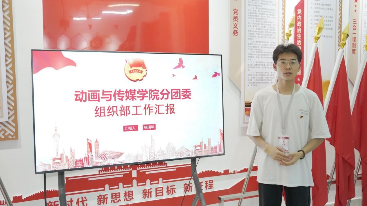动画与传媒学院分团委书记巴瑞斌首先发表致辞。随后,他结合工作实际用详实的数据支撑,将近一年学院团学系统发展情况向学院领导以及与会书记进行了汇报。同时他对各班级团支部提出三点希望:第一:切实加强团员思想引领建设,提升政治觉悟。希望各班级团支部以此青年大学习网上主题团课、团日活动为契机,主动要求、主动申请、主动提升;第二:贯彻学院团委“专业+活动”的活动开展方式,以专业带动活动开展,以活动辅助专业提升;最后:希望各班级团支部以此次会议为起点,强担当、抓落实、争一流,为学院发展做出更大的贡献!