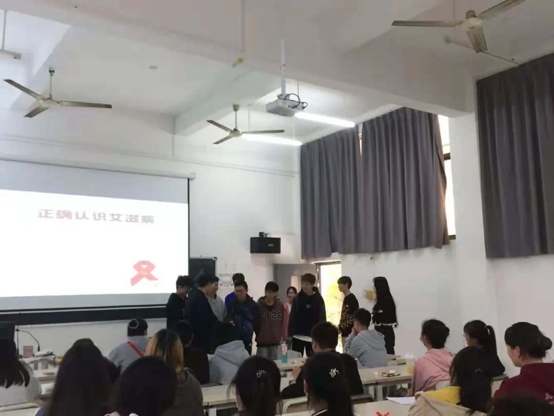本次活动的开展形式主要以班级内部PPT宣讲为主,内容包括但展示防艾知识视频、模拟“艾滋病在日常生活中的传播”主题互动游戏、相关艾滋病预防、科普知识答题以及艾滋病的自我检测和事后预防机制等。