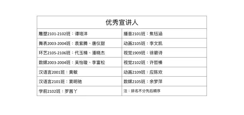 校团委青年志愿者协会成员分成小组评委,前往各个班级宣讲现场进行听讲并做出评价,根据是否使用原创PPT、宣讲人宣讲能力、班级同学配合度等相关标准进行综合评定,最后评选出本次活动的获奖班级及优秀宣讲人。