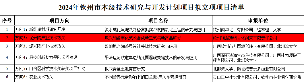 近日,钦州市科学技术局公布了2024年钦州市本级技术研究与开发计划项目拟立项项目名单,我校学生创业项目《坭兴陶数字化艺术合成新工艺与新产品研发》拟立项为钦州市本级技术研究与开发计划项目。
