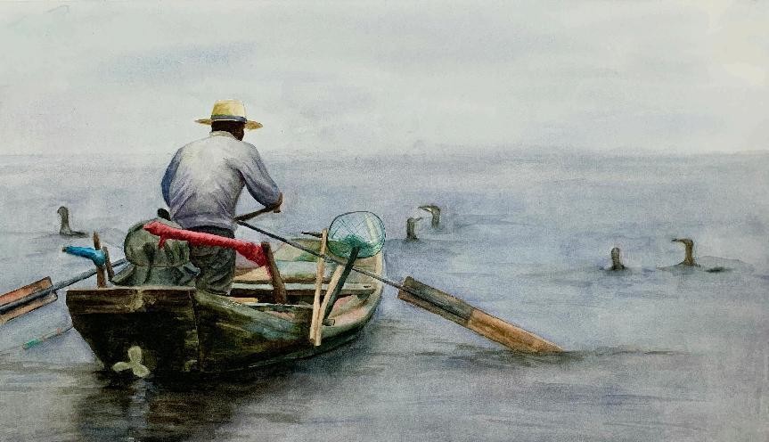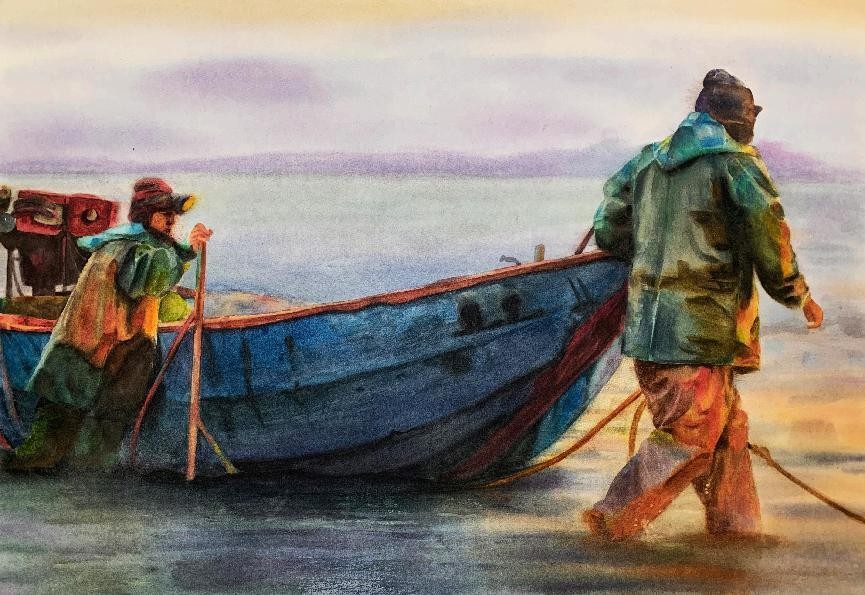 绘画 1906 班 徐妹丁《打鱼人》76×55cm 水彩 指导教师:刘广滨、段凝