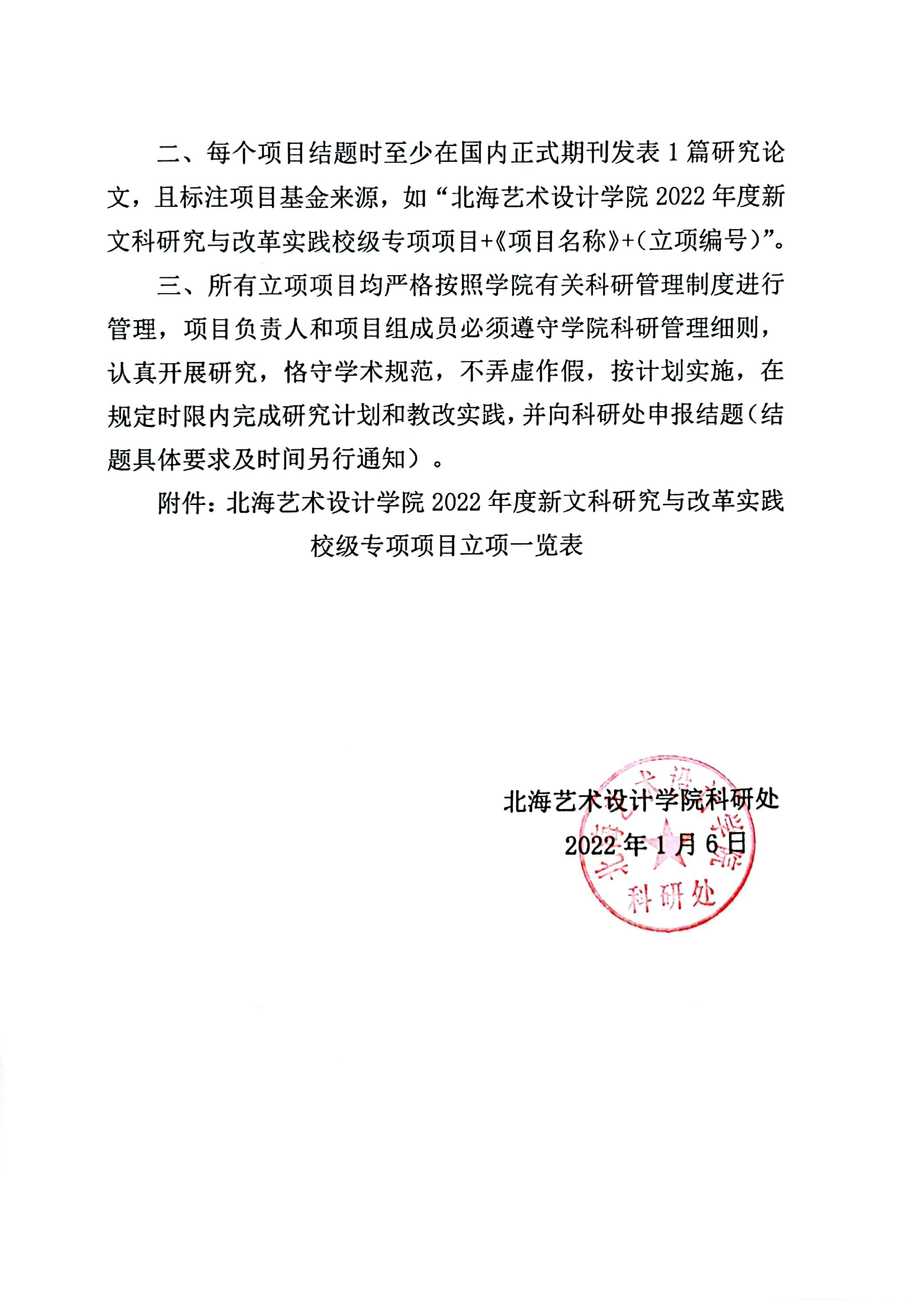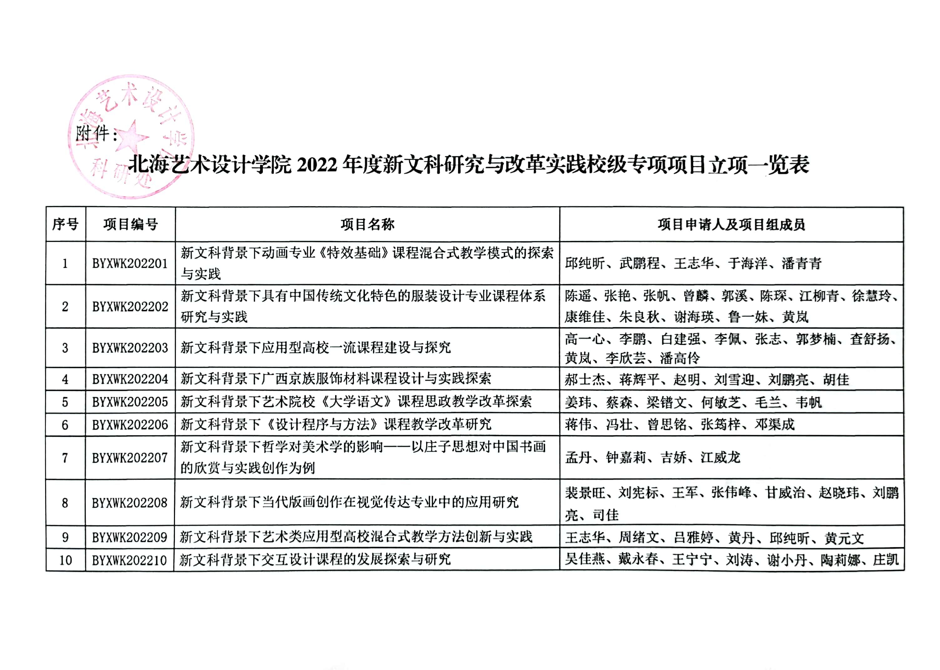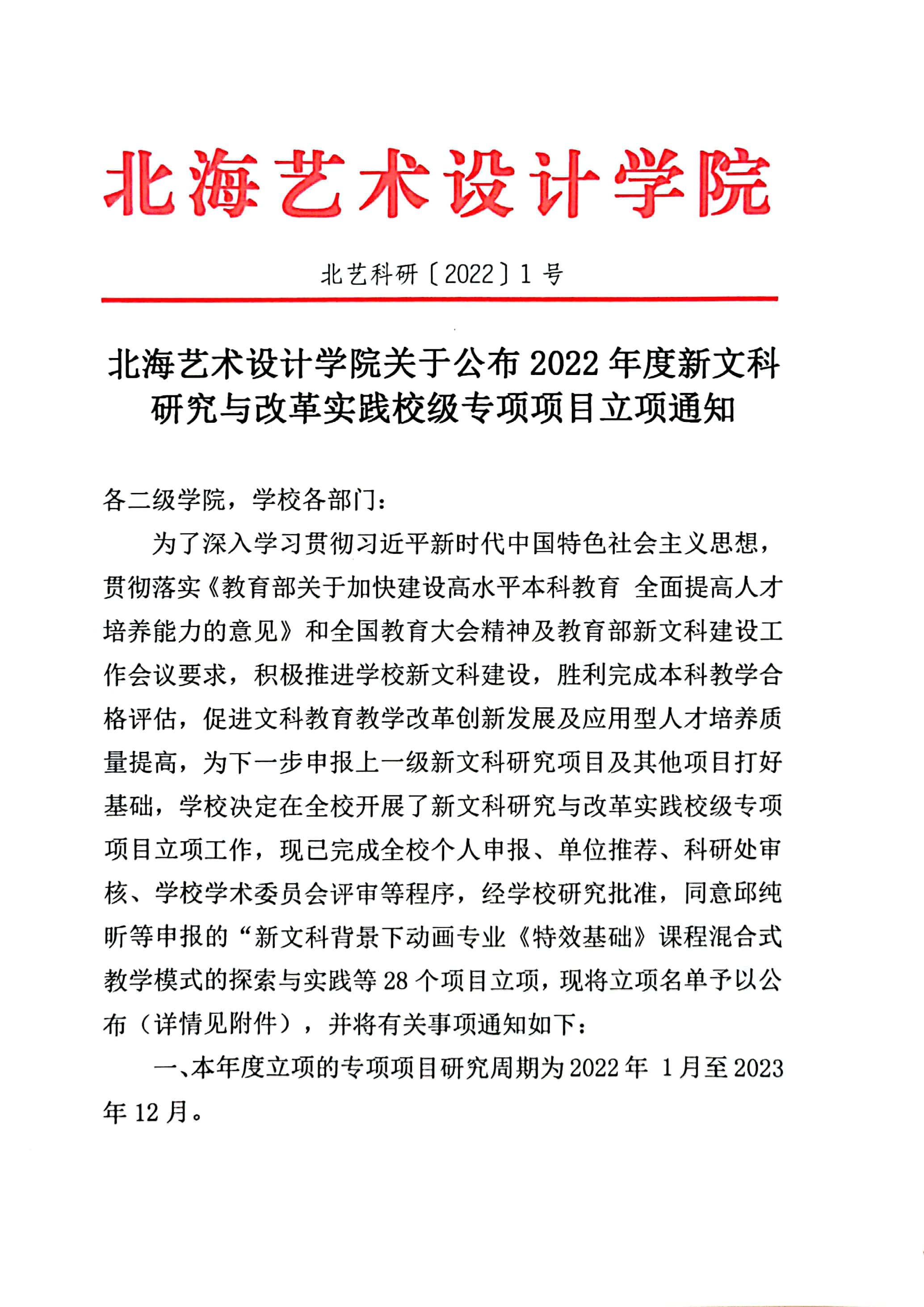 北艺科研〔2022〕1号 北海艺术设计学院关于公布2022年度新文科研究与改革实践校级专项项目立项通知