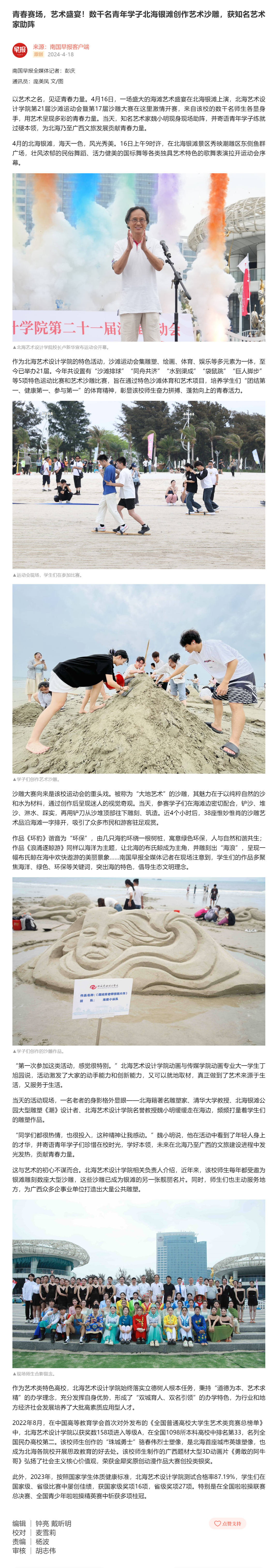 南国早报:青春赛场,艺术盛宴!数千名青年学子北海银滩创作艺术沙雕,获知名艺术家助阵