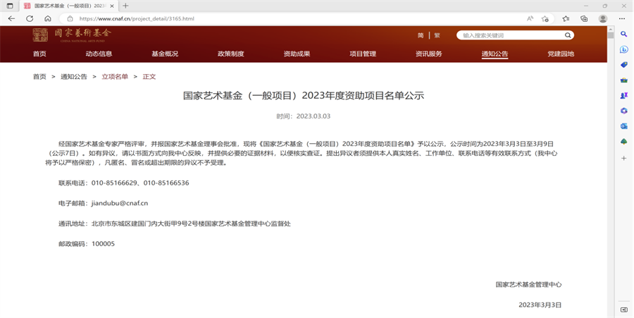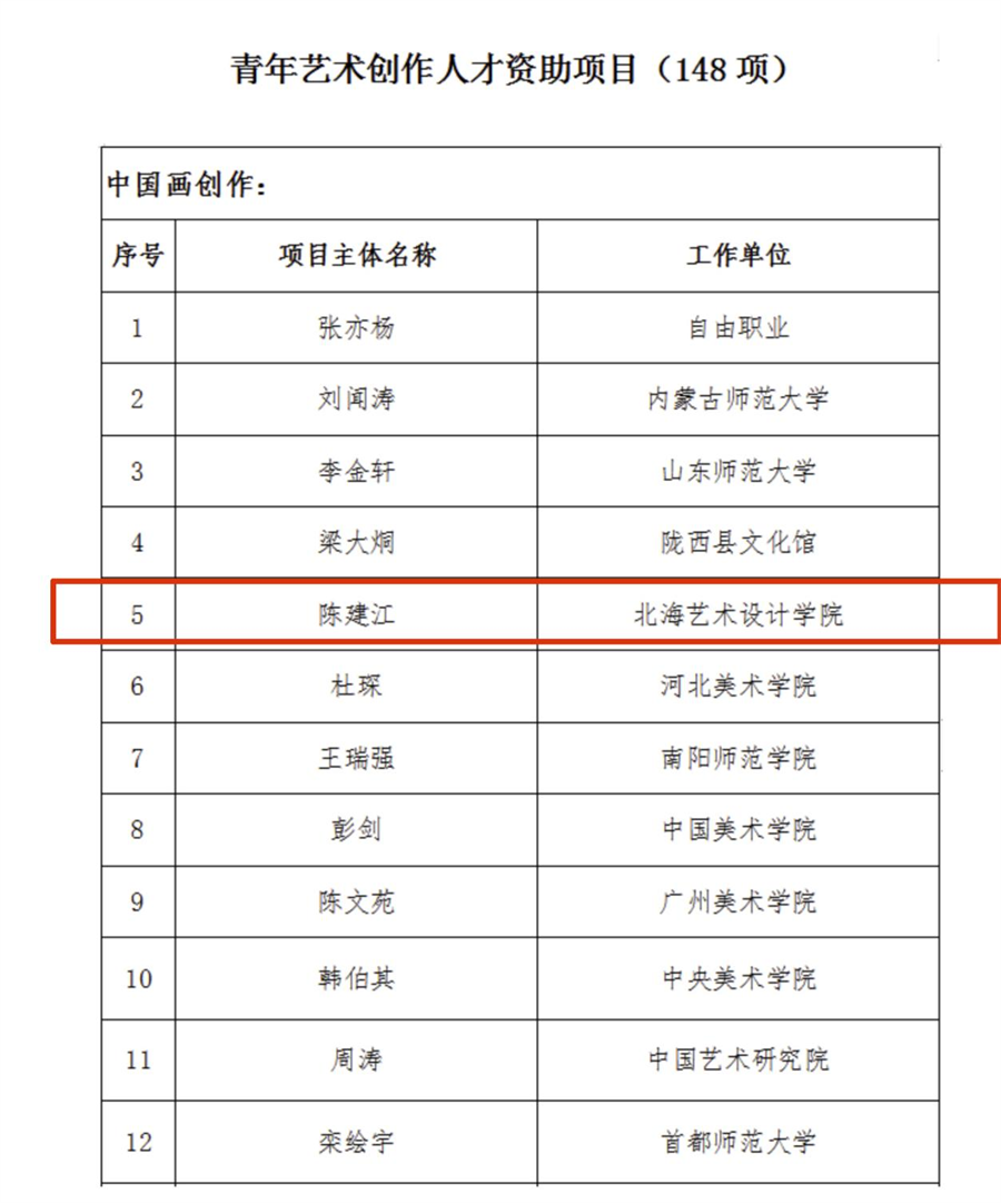 3月3日,国家艺术基金管理中心发布《国家艺术基金(一般项目)2023年度资助项目名单公示》,我校美术学院教师陈建江获青年艺术创作人才项目(中国画创作)立项,这也是我校唯一在获得此类立项的项目。