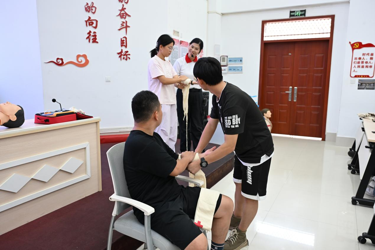 理论讲解之后,林老师利用教具进行了操作演示,并邀请志愿者上台实操演练。在老师的指导下,同学们练习了急救包扎、心肺复苏和AED使用,掌握了关键要领。这些实用技能的培训使志愿者们不仅掌握了基本的急救技能,更增强了面对突发事件时的心理素质与责任意识。