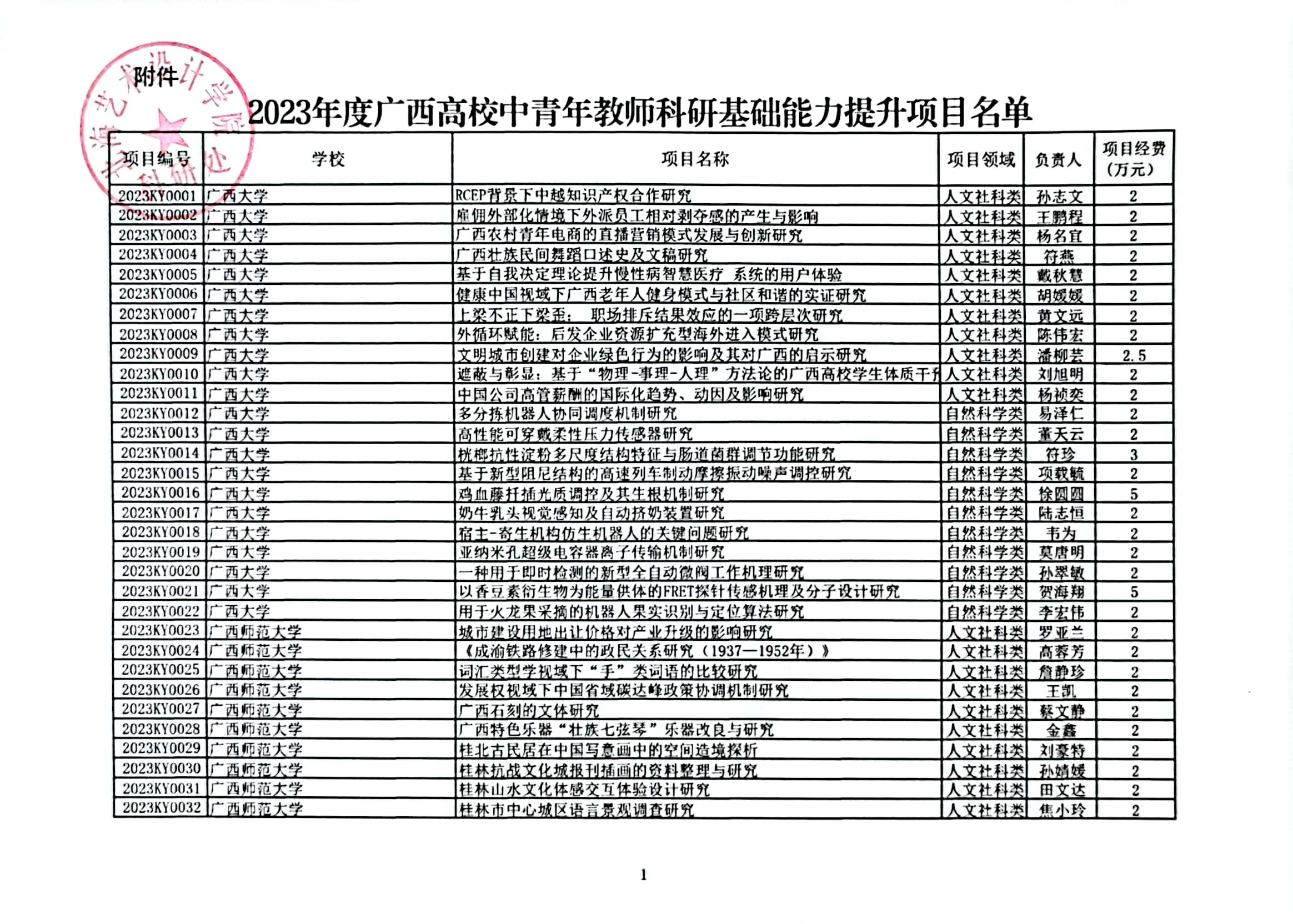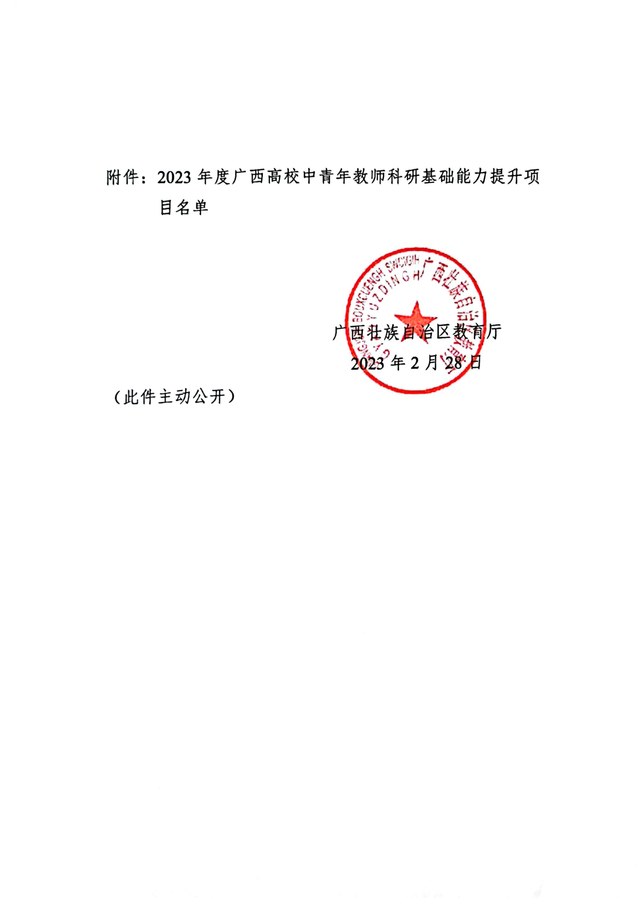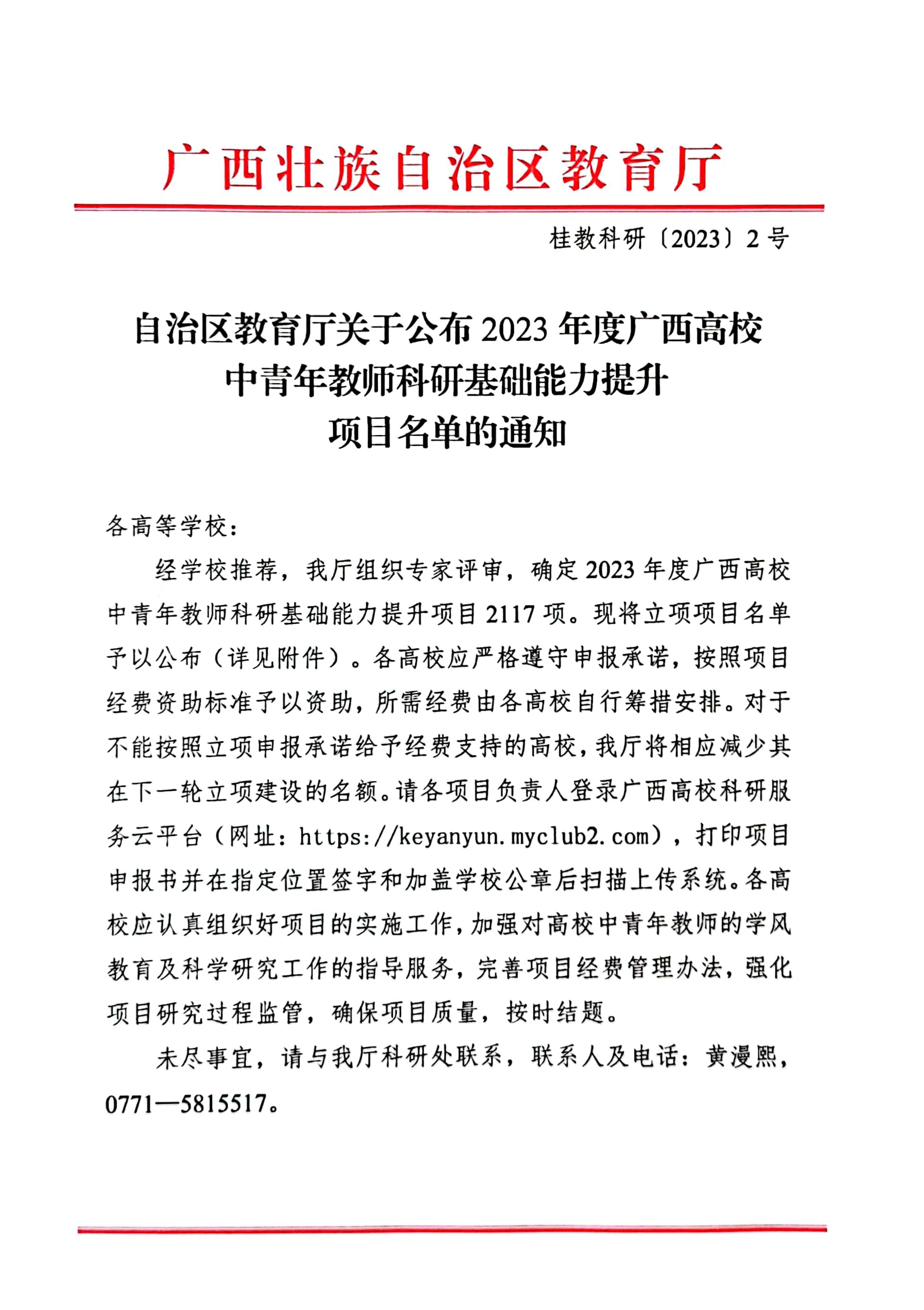 自治区教育厅关于公布2023年度广西高校中青年教师科研基础能力提升项目名单的通知