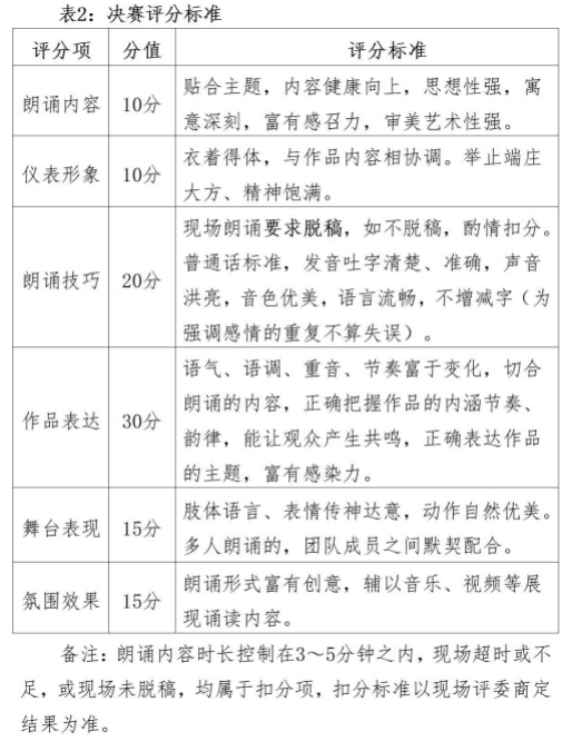 (二)朗诵要求。使用普通话朗诵,时长严格控制在3—5 分钟内。