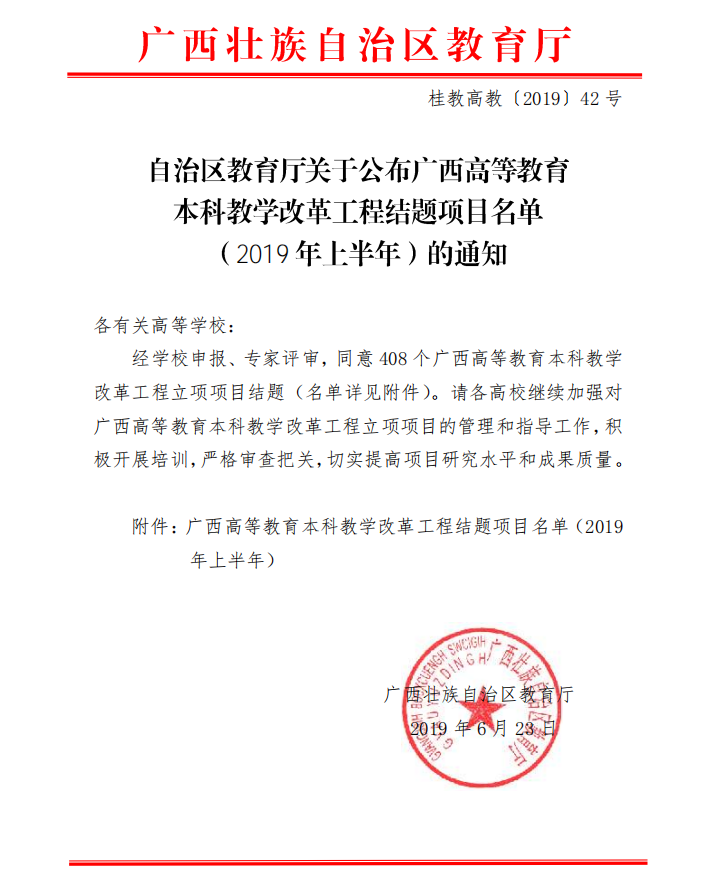 附件:桂教高教〔2019〕42号自治区教育厅关于公布广西高等教育本科教学改革工程结题项目名单(2019年上半年)的通知