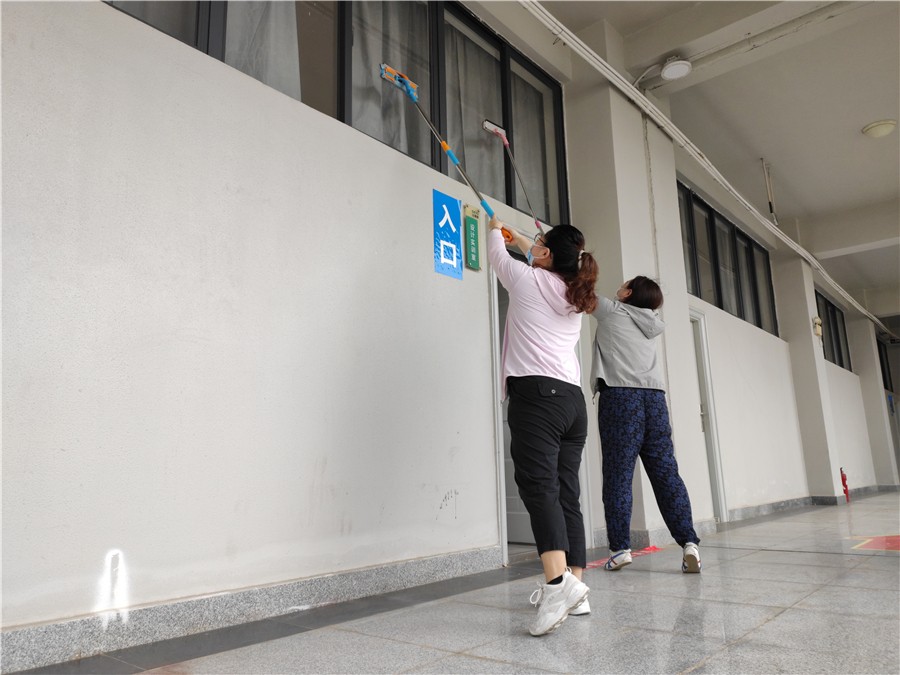 5月1日至2日,学校统筹安排各部门对照疫情防控卫生标准,对东西校区的教学楼、办公楼、宿舍区、图书馆、实训室、工作室、食堂、绿化区等公共区域开展卫生死角清洁工作,并对照防控要求规范教室桌椅摆放及室内防疫标识的张贴。经过全校教职工两天的努力,门窗、风扇、墙面、栏杆、地面擦拖干净,布置美观,物品摆放整齐,校园环境整洁一新。