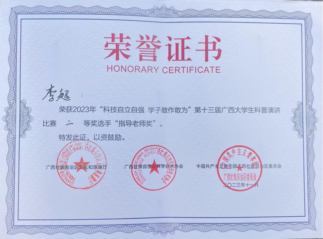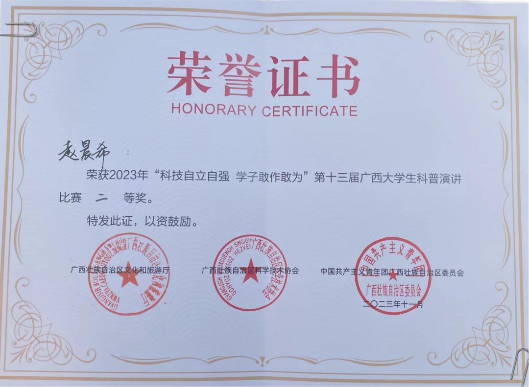 近日,由自治区文化和旅游厅、自治区科协、共青团广西区委共同主办的第十三届广西大学生科普演讲比赛决赛在南宁举行。我校动画与传媒学院播音与主持艺术专业2101班的赵晨希同学代表北海市参赛,凭借出色的表现,荣获比赛二等奖的佳绩。指导老师李超荣获“优秀指导教师”的荣誉称号。