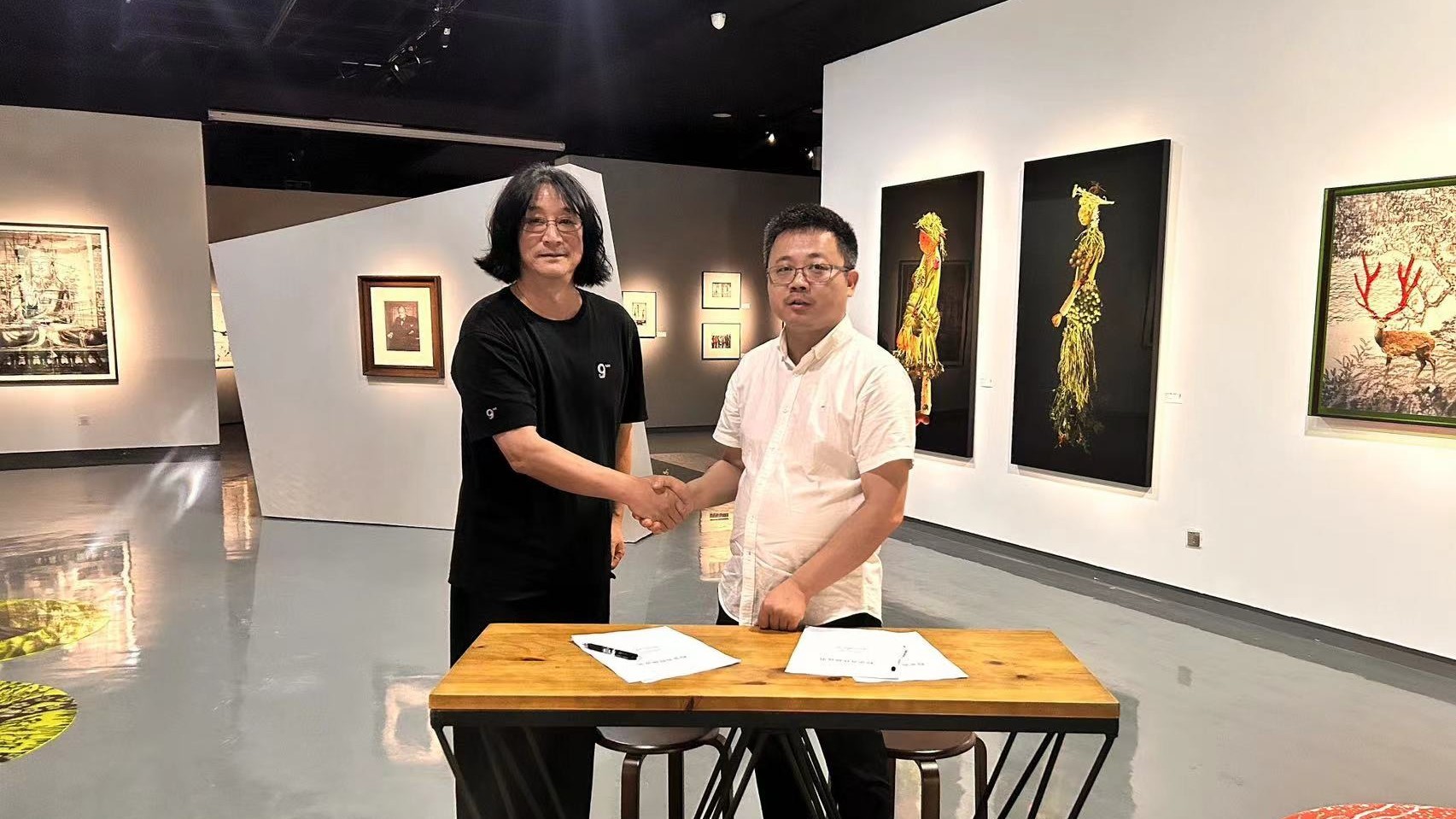 美术学院龚为院长与胡国庆主席就实习就业、课程建设、项目研发等资源共享的相关事宜进行深入探讨,并与九月艺术馆签订校企合作协议。期间胡国庆主席表示九月艺术馆秉承着典藏精品、展览展示、公共教育、对外交流等多方面的社会使命与责任感,在与我校就业合作的过程中将进一步推进专业性与社会性的融合。