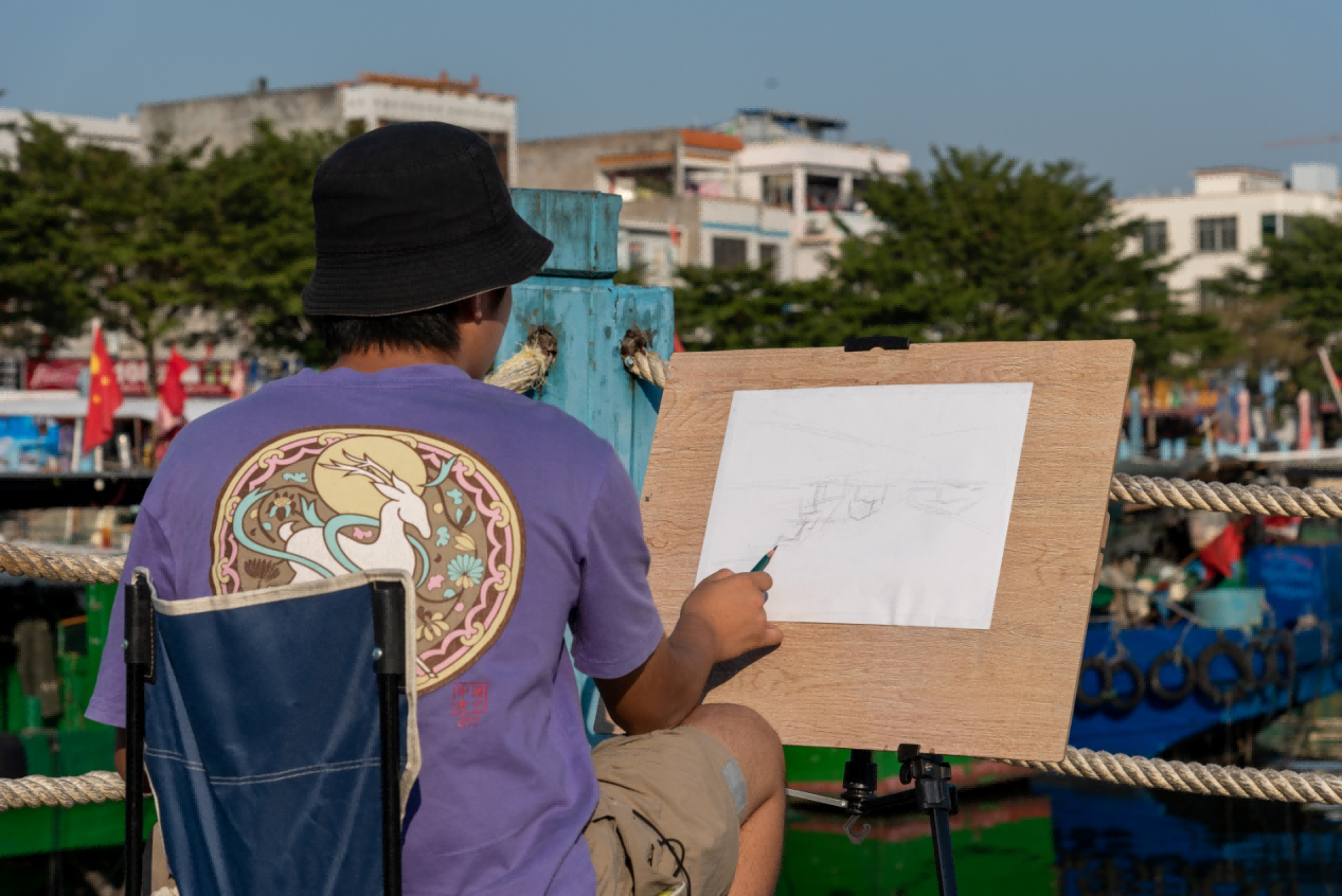 受主办方的邀请,北海艺术设计学院美术学院三十多名师生于4:30分到达侨港风情码头并投入绘画。