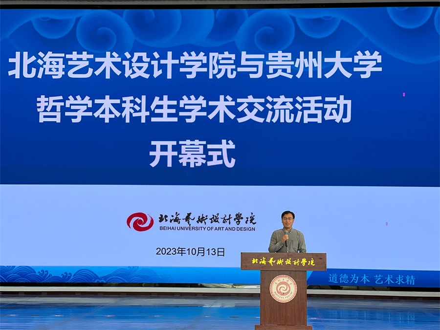 贵州大学哲学学院宋君修副教授结合北海艺术设计学院的校史和校园文化,对我校“道德为本、艺术求精”的办学理念给予肯定,指出我校的碑刻文化蕴含着丰富的哲学思想,并期待两校的交流活动精彩、成功。