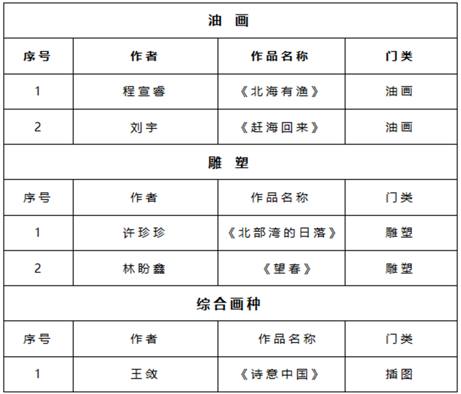 近日,全国第十四届美展复评结果公布,我校美术学院程宣睿、刘宇、许诊诊、林盼鑫、王敛共五名教师作品通过第十四届全国美术作品展览油画、雕塑、综合画种展区复评。