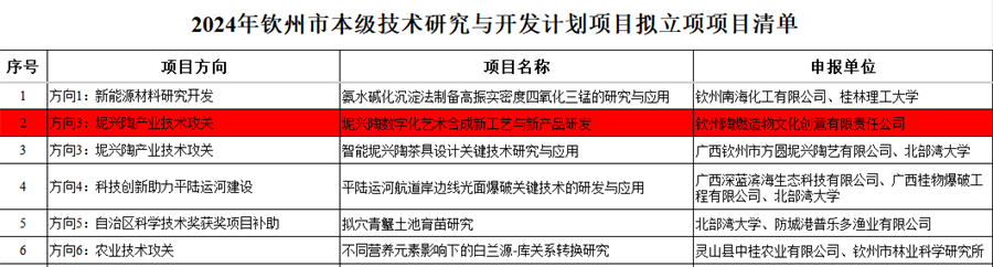 近日,钦州市科学技术局公布了2024年钦州市本级技术研究与开发计划项目拟立项项目名单,我校学生创业项目《坭兴陶数字化艺术合成新工艺与新产品研发》拟立项为钦州市本级技术研究与开发计划项目。