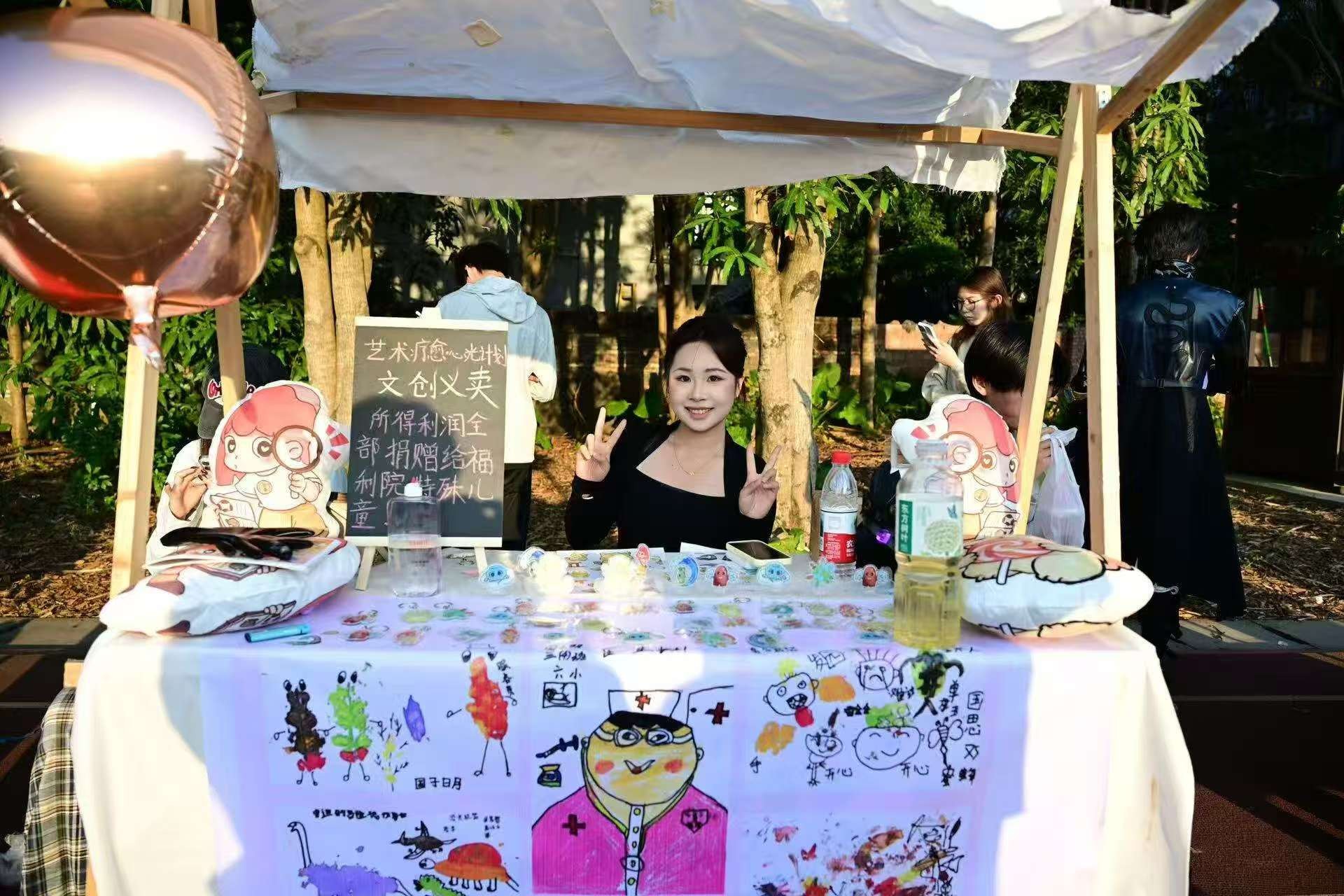 系列课程结束后,一场特殊的爱心义卖在校园内开展。义卖摊位上,每一幅作品都承载着孩子们的童真与梦想。志愿者们为福利院儿童创作的动漫文创IP引得过往师生驻足选购。